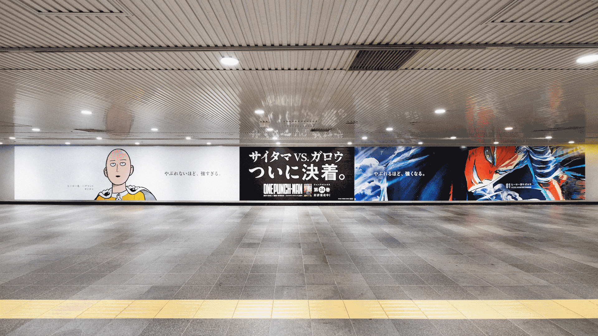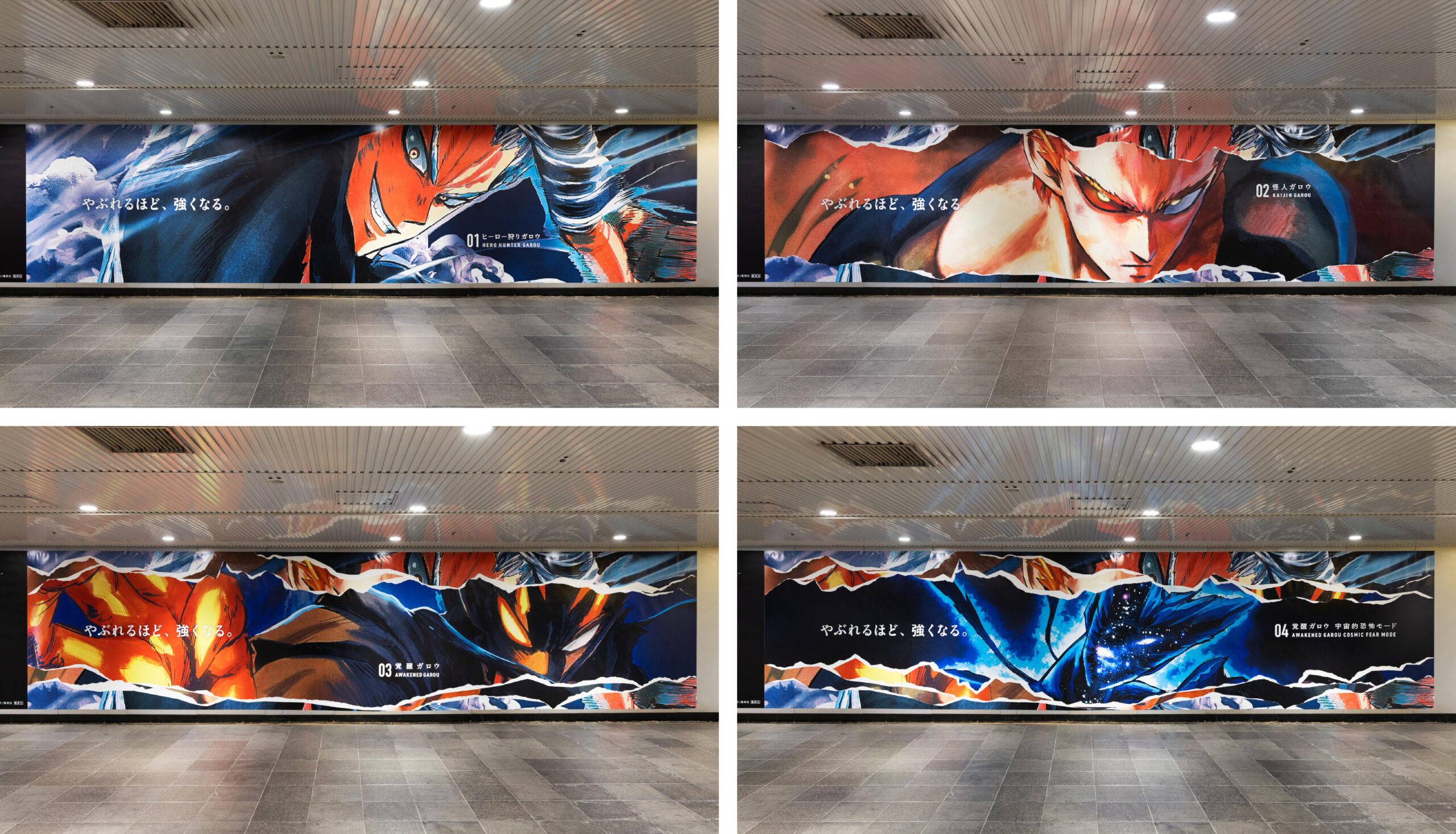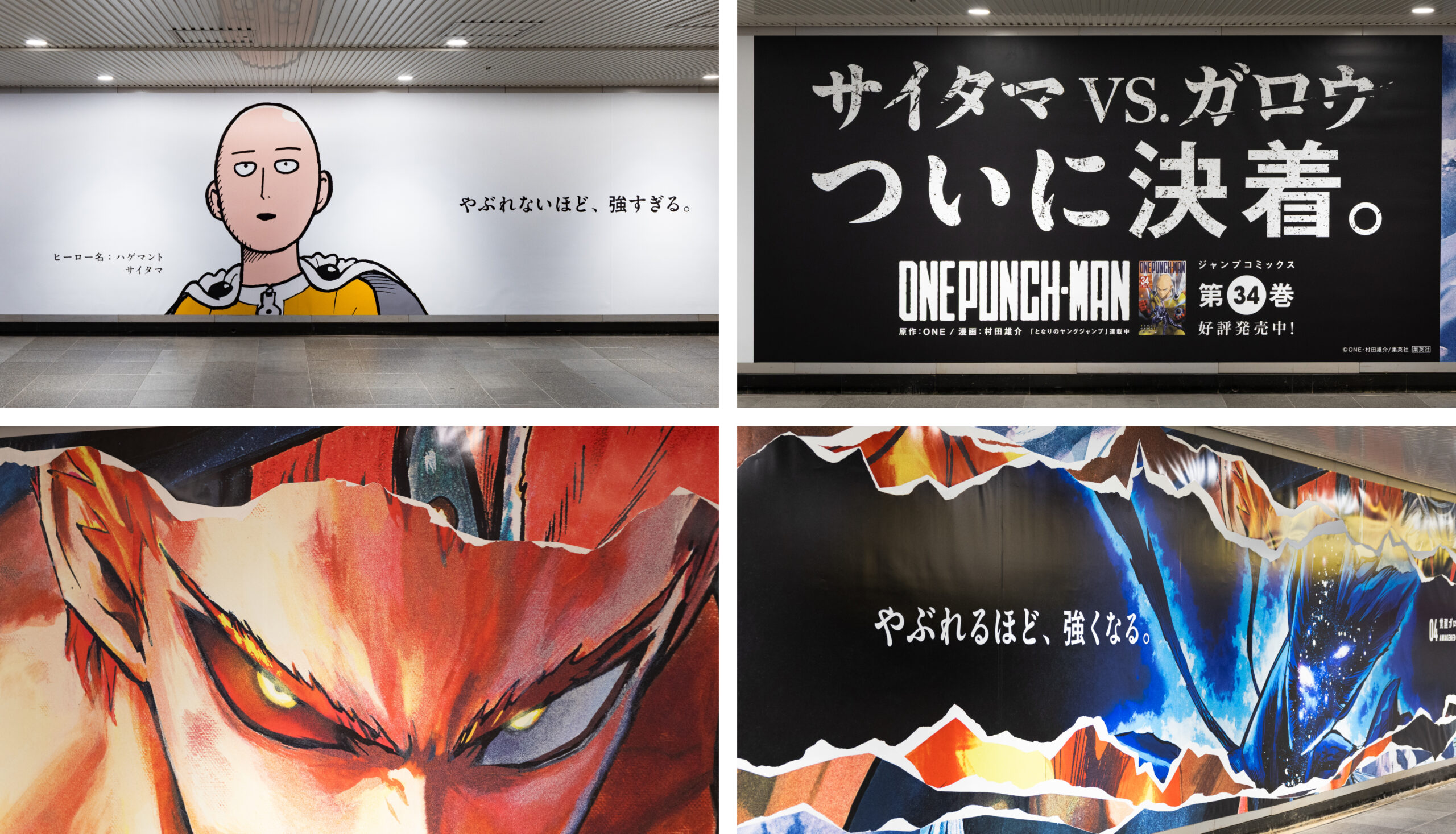 集英社のとなりのヤングジャンプで連載中の漫画「ワンパンマン」34巻発売の告知広告を制作しました。どんな敵もワンパンで倒す最強のヒーローサイタマ。対するガロウは、最初こそ無名のヒーロー狩り。数多のヒーローと対戦し苦戦や敗北を喫しますが、負けるたびに進化しサイタマに匹敵する力を持った作中最恐の怪人です。決してやぶれることのないサイタマに対し、ガロウはやぶれる(敗れる/破れる)ほどにビジュアルが進化していくOOHとしました。