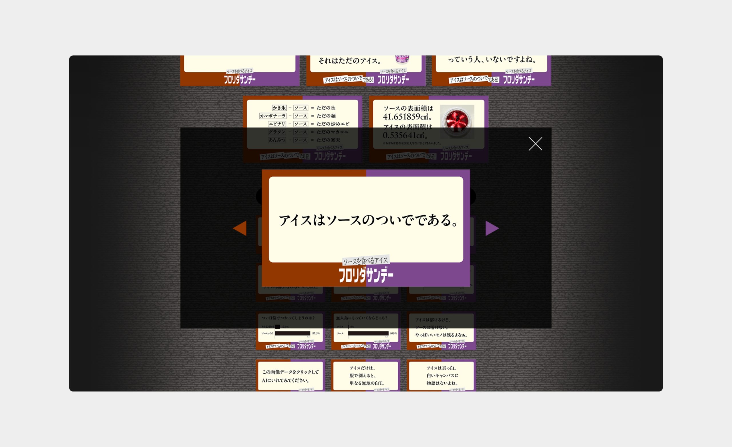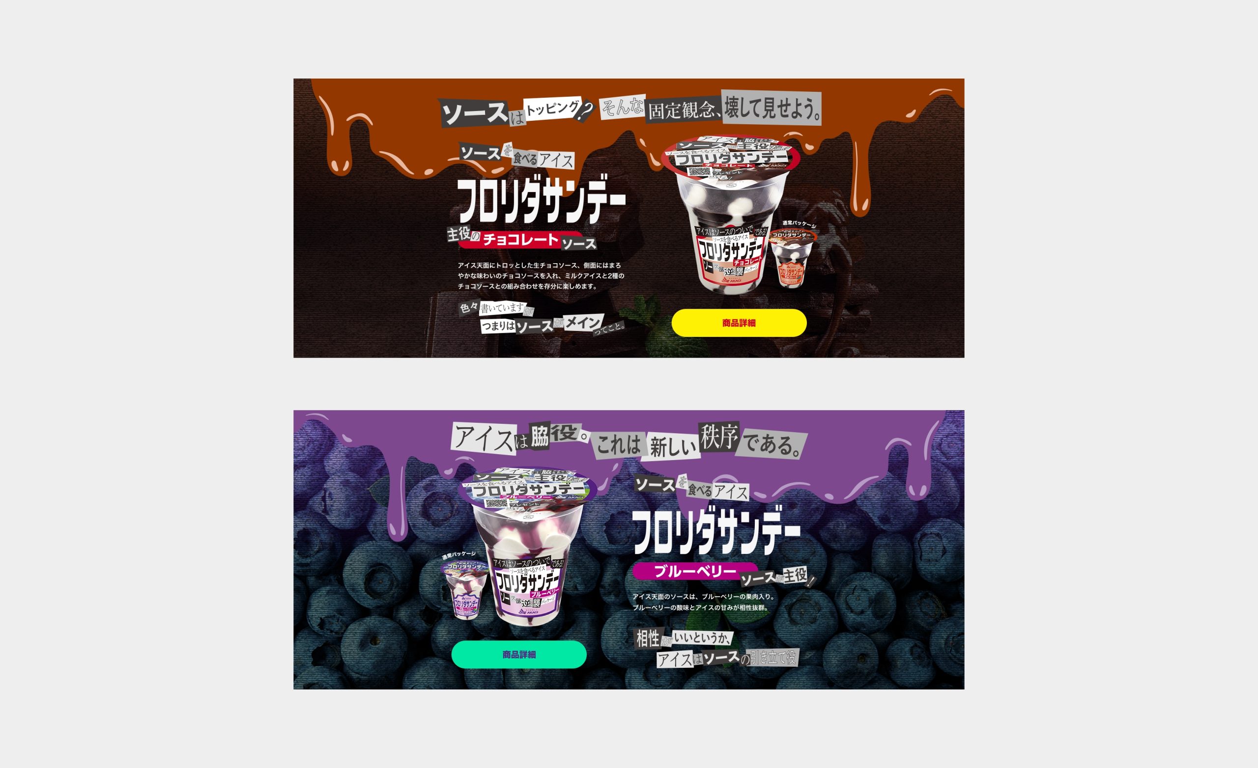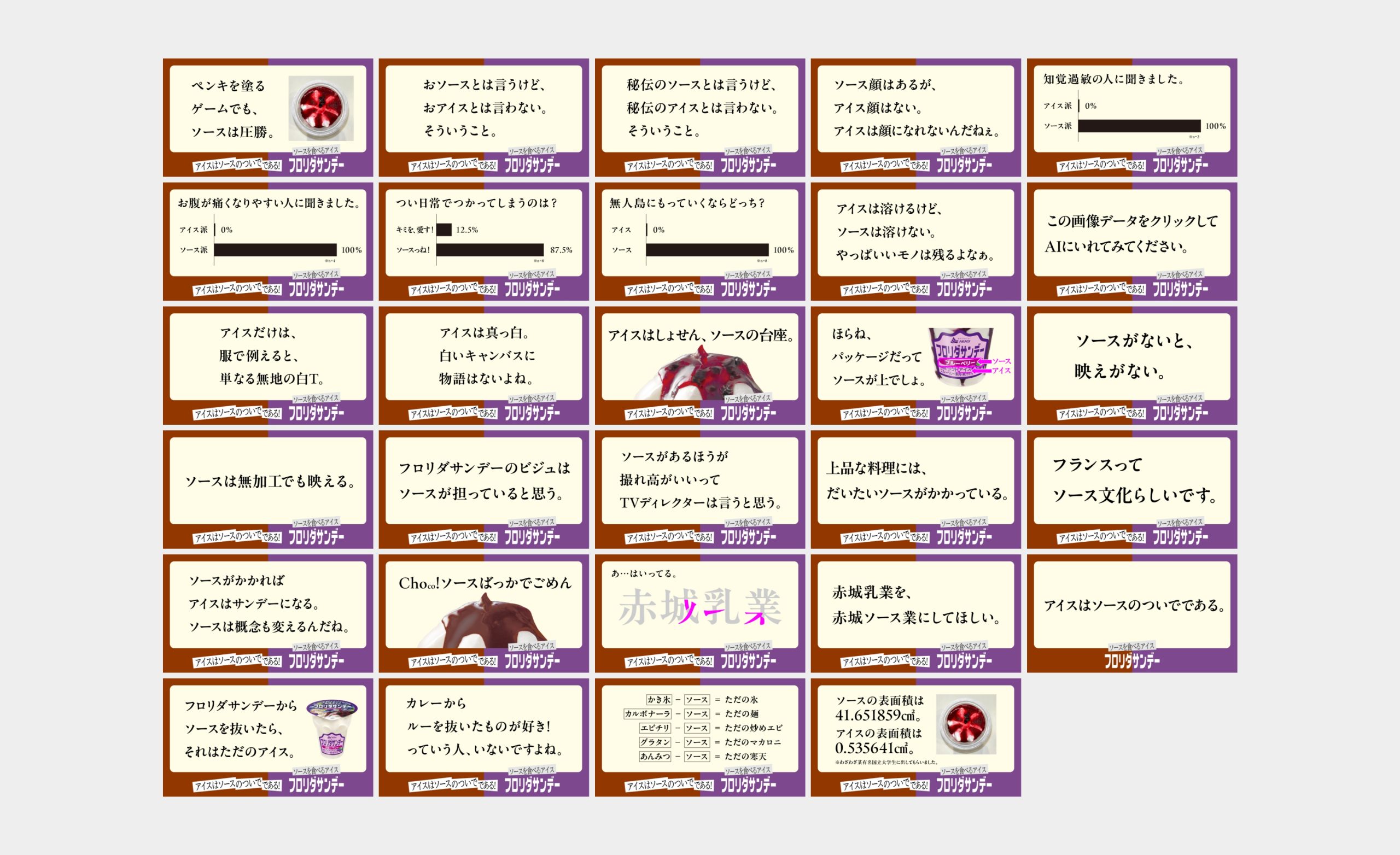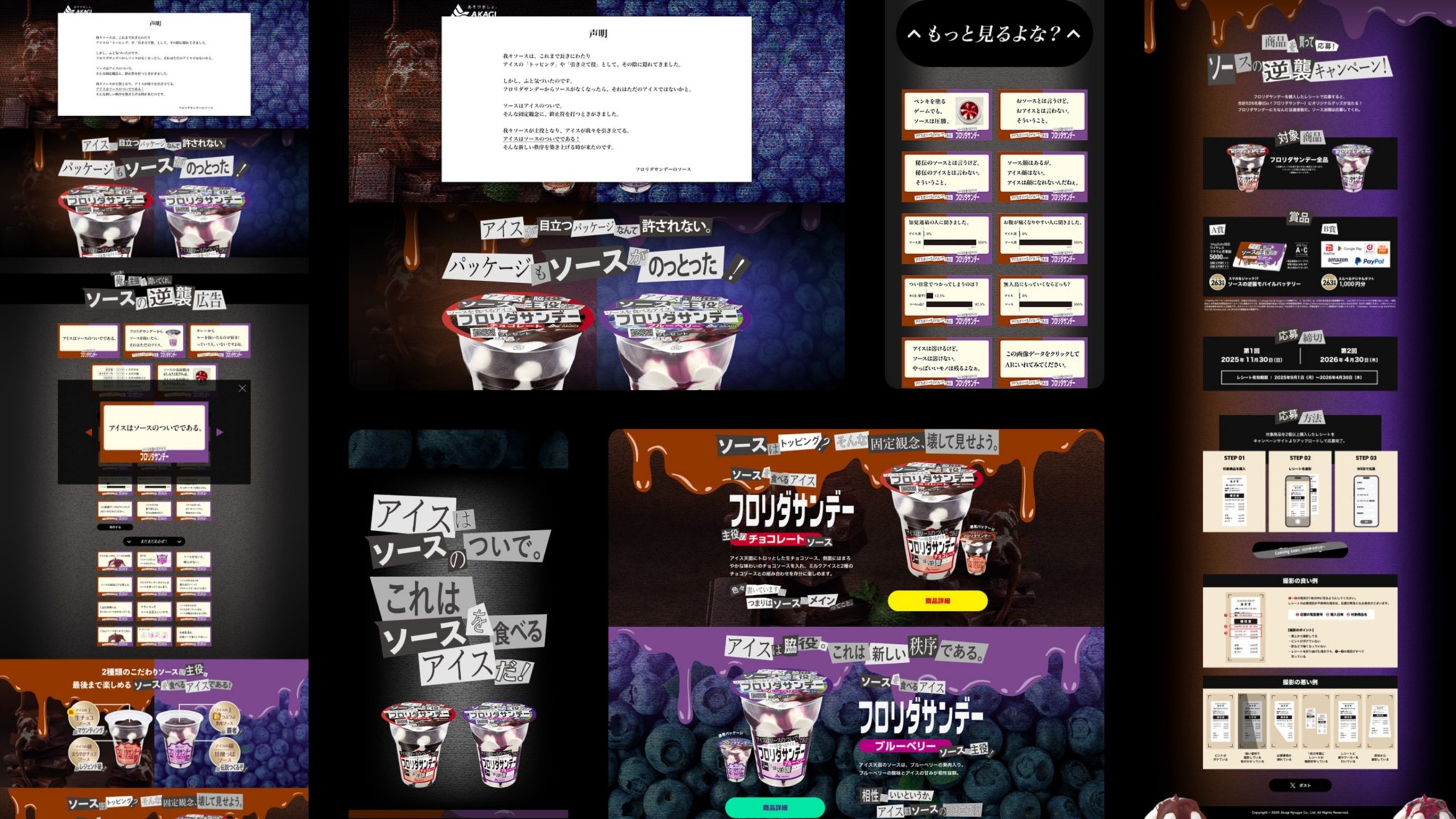 1980年代に発売され、2020年に復活したフロリダサンデー。 たっぷりのソースとミルクアイスが特徴のアイスですが、今回はその“ソース”が主役の座を奪いにかかるという、 ユニークな企画のもとLPを制作しました。冒頭では実際に、ジャックされたような演出でグリッチノイズが入り、声明文が浮かび上がる演出を施し、さらに新聞の切り抜きをコラージュしたようなタイポグラフィで展開。